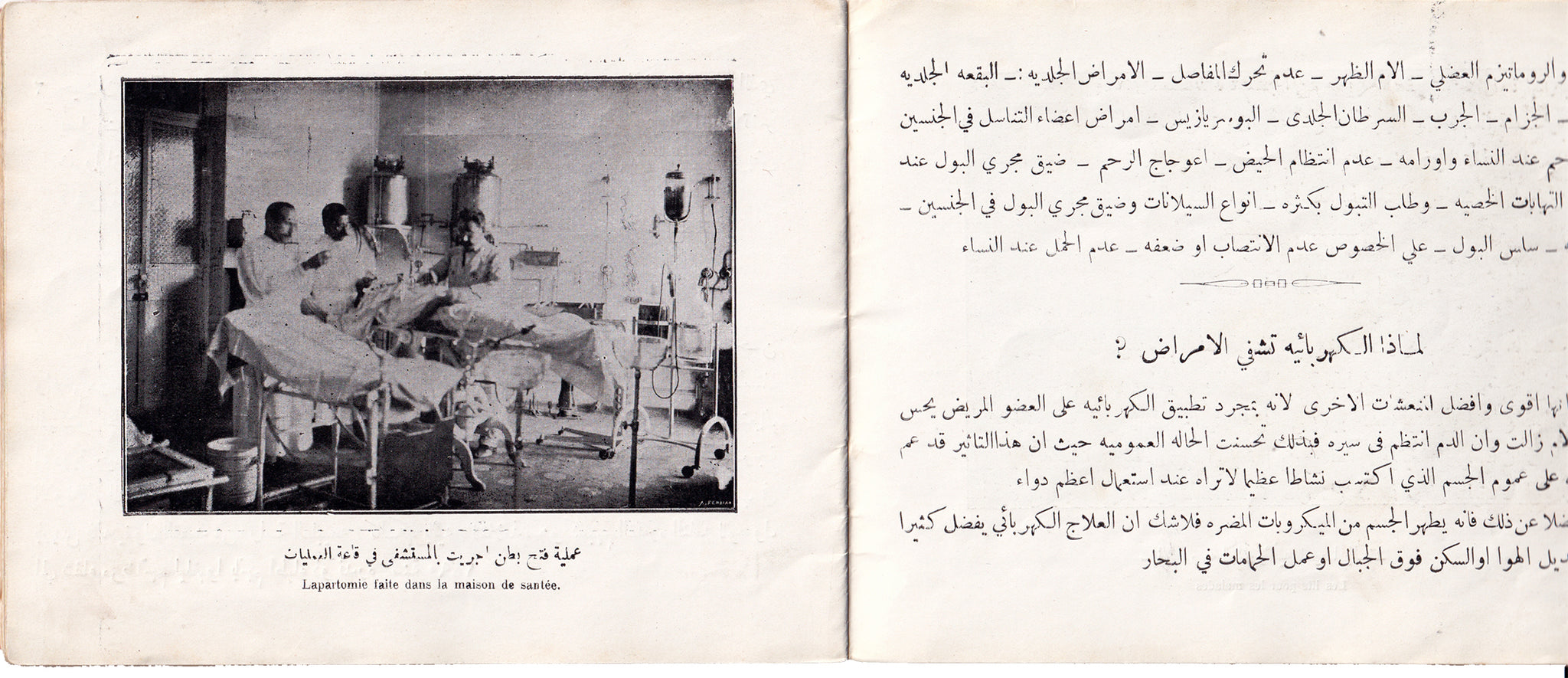 In the album, the medical services provided at the private hospital including "the complete installation for general surgery, electrotherapy, and radiology (ordinary and intensive X-ray), with a chemical and microscopic research laboratory", founded by Şakir in Cairo are presented through rich visual material; the images include the medical equipment used in electrotherapy and radiotherapy, hospital staff, the services offered, and information about the hospital’s location.