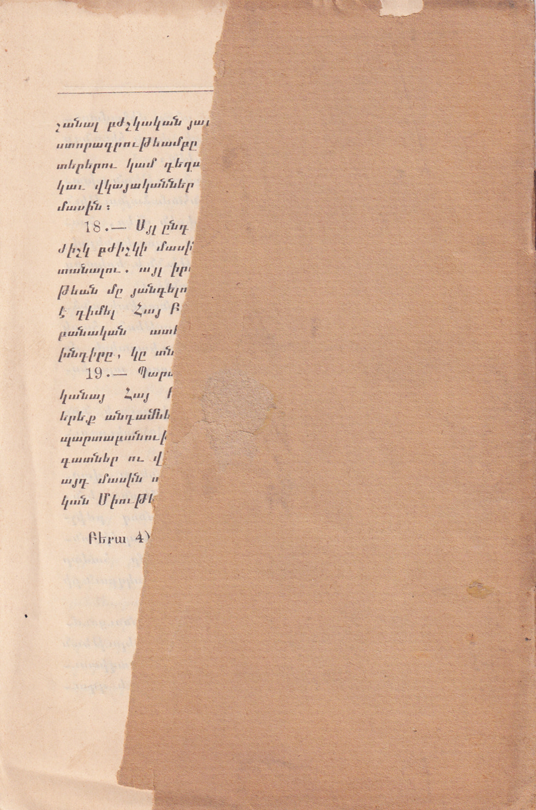 Original greenish wrappers. Foolscap 8vo. (17 x 12 cm). In Armenian. 5 p. Heavily chipped on the extremities of the front cover, missing half of the rear cover. Occasional fading. Overall, a fair and complete copy.