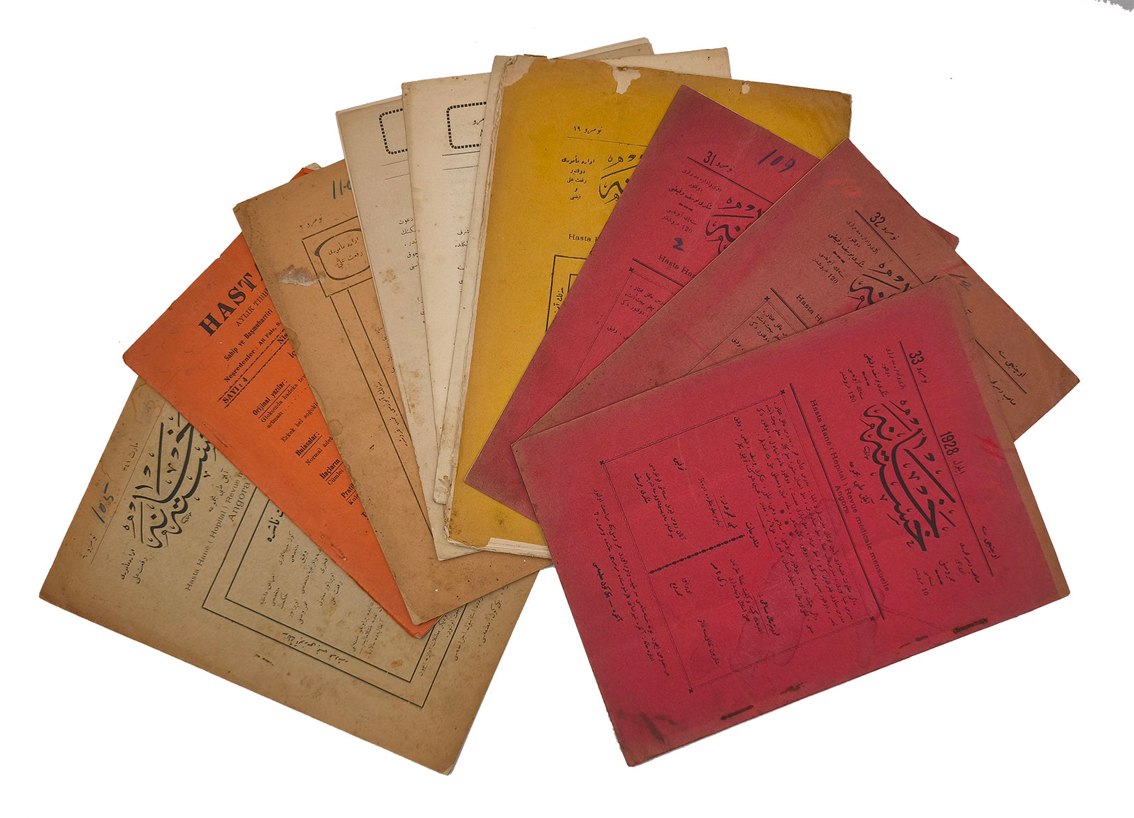 [THE FIRST OFFICIAL MEDICAL JOURNAL OF THE NEW REPUBLIC] Hastahâne: Aylik tibbî mecmua = Hôpital: Revue medicale mensuelle. Nos: 2, 3, 6, 8, 19, 29-33, and the last issue in Latin script (11 issues of 39). [i.e., Hospital: A monthly medical journal.]